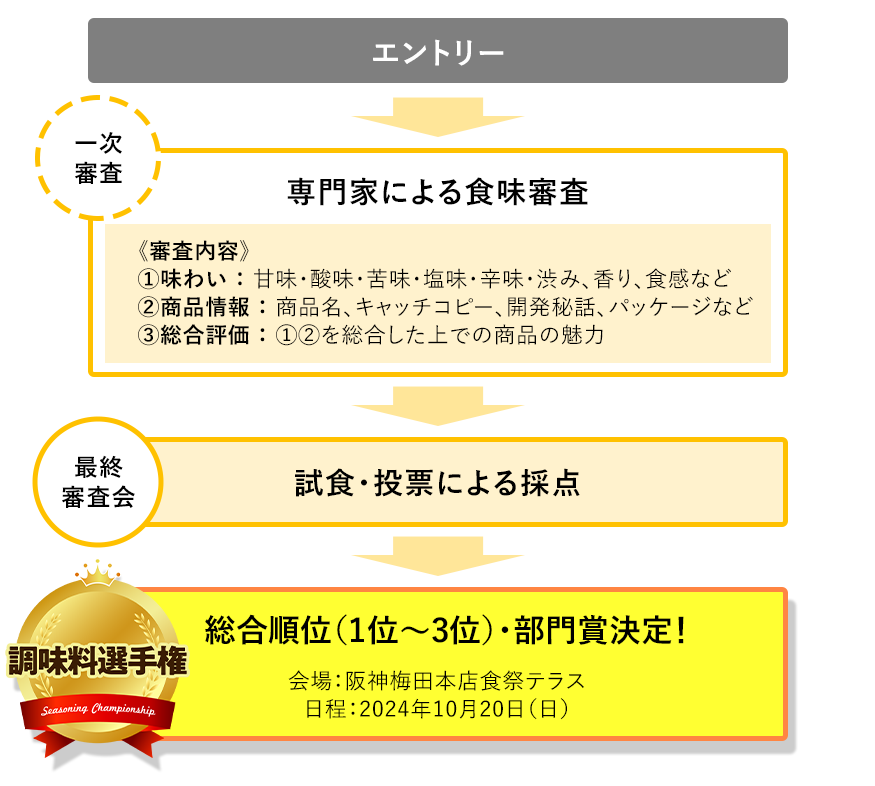 阪神梅田本店にて、試食・投票による採点、販売会での販売実績、一次審査の得点を集計し、第15回調味料選手権総合順位(1位~3位)・部門賞を決定します。