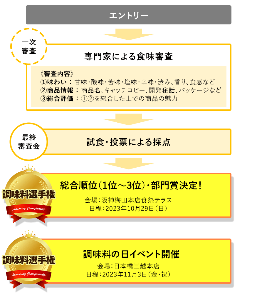 阪神梅田本店にて、試食・投票による採点、販売会での販売実績、一次審査の得点を集計し、第14回調味料選手権総合順位(1位~3位)・部門賞を決定します。