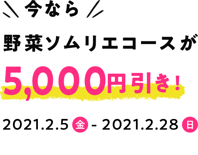 今回、「野菜ソムリエコース」にお申し込みいただくと、受講料から5,000円(税込)引きの特別価格でご受講頂けます!期間限定ですので、この機会をお見逃しなく! 対象講座 野菜ソムリエコース2021年2月5日(金)~2021年2月28日(日)お申込み分まで クーポン番号 smile2021148,000円(税込) → 143,000円(税込) 申込方法 お申込み時に、クーポン番号を入れてウェブサイト、FAX、または、お電話にてお申し込みください。 注意事項 他キャンペーン、他クーポンとの併用はできません。 お申し込みはこちら
