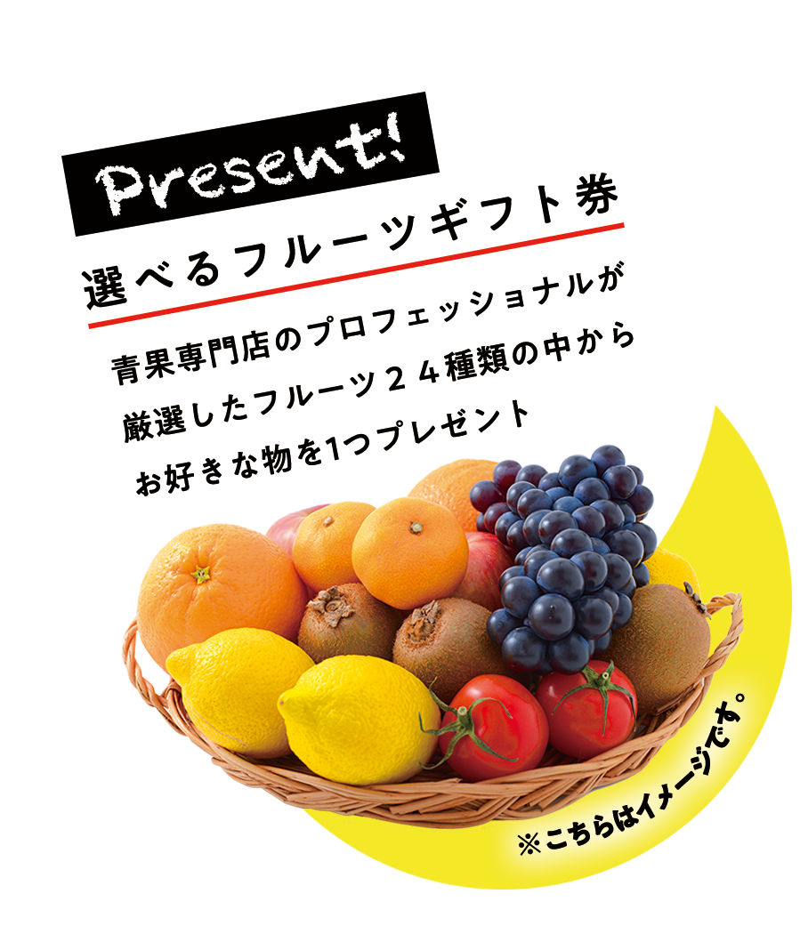 期間中、野菜ソムリエコースにお申込みいただいた方全員に、『選べるフルーツギフト券』をプレゼント!青果専門店のプロフェッショナルが厳選したフルーツの中からお好きな物を1つ選んでいただけます。
