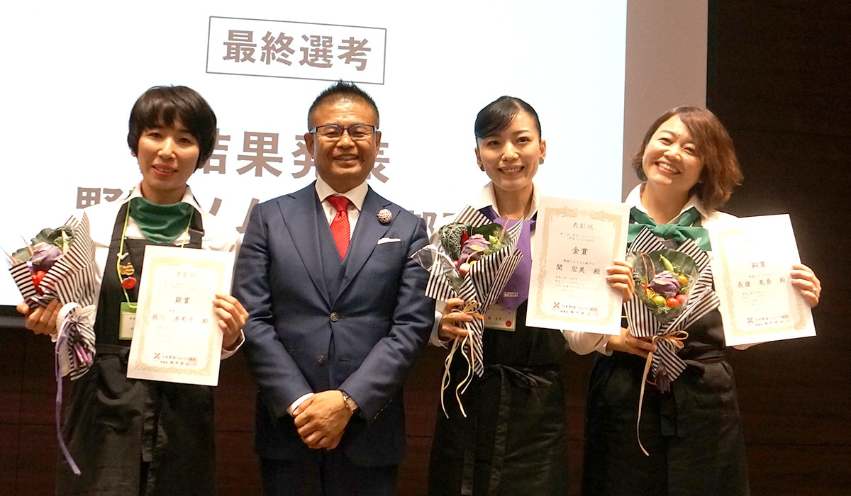 第7回野菜ソムリエアワード結果発表 2018年4月14日に、第7回野菜ソムリエアワードの最終選考を開催いたしました。 最終選考では、審査員(特別審査員+参加者※野菜ソムリエ資格保持者)による審査で、プレゼンテーションで一番共感を得た発表者が選ばれました。 受賞者は以下の通りです。 発表者のプレゼン資料はこちら 野菜ソムリエ部門 金賞 関 宏美(奈良県) 読み聞かせオーケストラや自身の絵本で食育を 母心が生んだ新たな食育法、絵本×音楽×野菜ソムリエの『Vege-fru 読み聞かせオーケストラ』で食育を行う。 読み聞かせオーケストラは、記憶形成のメカニズムと聴力の力を応用し、自主的に「食べてみたい」を引き出す食育アプローチ法。 また、自身で出版した絵本「神さまの木の実」を地元五條市に寄贈。保育園33箇所に配布。 銀賞 西川 満希子(山口県) ※写真・左 野菜果物言葉の文化を作る “野菜果物言葉”を創作し、野菜果物言葉の文化を作る活動を行う。 愛や感謝を伝える花のように、野菜果物がストーリーのある料理を紡いだり、メッセージを込めた野菜果物のギフトで想いを伝える。 トマトの野菜言葉は「平和」、里芋の野菜言葉は「努力の実り」。 里芋の野菜言葉はおみくじにもなった。 銅賞 長嶺 美香(沖縄県) ※写真・右 ラジオ番組で野菜ソムリエの魅力を発信 ラジオ番組『野菜ソムリエスタジオ』でパーソナリティを担当。メディアを通して資格の魅力を発信。RBC i-radioで毎週土曜AM9:00から放送されている。 2015年7月にスタートした番組は、2017年末で130回目の放送を迎えた。 番組内では、実際の自身の資格取得の様子も紹介した。 野菜ソムリエコミュニティ部門 金賞 コミュニティみやぎ野菜ソムリエの会 仙台井土ねぎやイベントでみやぎの魅力を発信 仙台井土ねぎ復興支援活動を行う。 津波にあったレタス畑で塩害に強いねぎ栽培をスタート。仙台井土ねぎが誕生した。 仙台井土ねぎはグローバルGAP認証を得ている。 他、野菜の日記念イベントで「親子わくわく料理教室」を開催。メタボ県みやぎを返上しようと「メタボ対策親子料理教室」を行った。 ※グローバルGAP認証・・・国際的に安全管理の評価を得ている農産物であると認められる認証 銀賞 野菜ソムリエコミュニティいわて ※写真・左 新聞で野菜コラム「菜食健美」を連載し、まとめ本も出版 地元新聞で野菜コラム「菜食健美」を連載中。平成26年6月25日からスタートし、現在では月2回の掲載。 コーナーでは、400~600字のコラムと写真、レシピなどを載せている。 2017年8月31日(野菜の日)には、その記事をまとめ「野菜ソムリエ流 菜食健美」という一冊の本にし出版。 一旦完売したが、クラウドファンディングで増刷を考えている。 銅賞 野菜ソムリエコミュニティ広島 ※写真・中央 沢山のイベントで生活者と生産者の架け橋に 広島のブランド野菜や、伝統野菜の栽培協力に力を入れ、様々なイベントを開催し生活者と生産者の架け橋をしている。 イベントの内容は、「とうもろこし もぎ取り体験」や、「ビューティ講座@シェラトンホテル広島」。「広島市中央卸売市場訪問」「稲の田植え体験」など。 また、生産者と生活者の交流ビッグイベント「ひろしま 食×農フェス2017」も開催した。(参加者100名)